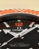Trái tim của chiếc Seamaster Planet Ocean này là bộ máy Co-Axial Master Chronometer Calibre 8912. Đồng hồ đi kèm dây cao su màu cam, nối với vỏ bằng mắt thép không gỉ và khóa gập chắc chắn. Ở mặt sau, nắp đáy vặn vít được làm từ titanium cấp độ 5, hoàn thiện chải xước và đánh bóng, nổi bật với biểu tượng cá ngựa huyền thoại của Omega.